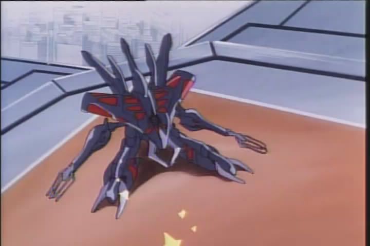 Guame leaps up, dropping Bangai-O on the ground, and transforming back to gorilla-like form.